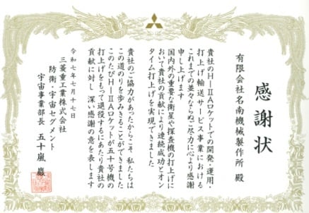 新着 一覧へ戻るHⅡロケット 三菱重工業㈱様から感謝状をいただきました。2025-07-17三菱重工業㈱様から感謝状令和7年7月17日、H2Aロケットが50号機の打ち上げをもって退役するにあたり、有限会社名南機械製作所は、その開発に貢献したことにより感謝状を頂戴しました。弊社の技術力が宇宙開発という国家的プロジェクトに活かされたことは、大きな誇りであり、今後も確かなものづくりで社会に貢献してまいります。